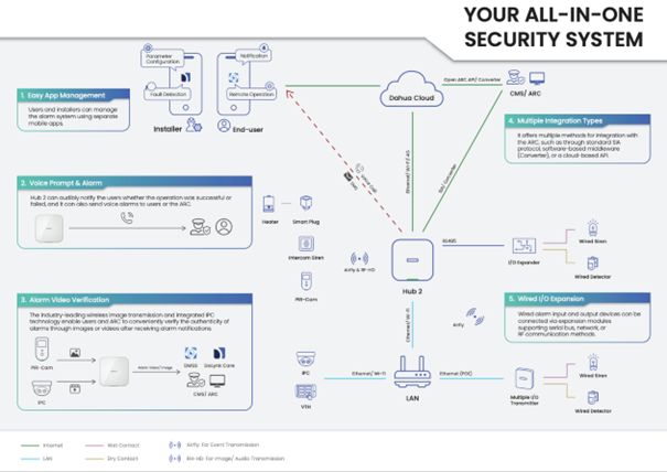 - Als de klant ook camera’s en intercom van Dahua gebruikt, heeft de klant deze 3 systemen in 1 gebruikers app en kan daarmee ook snel het alarm verifiëren.
